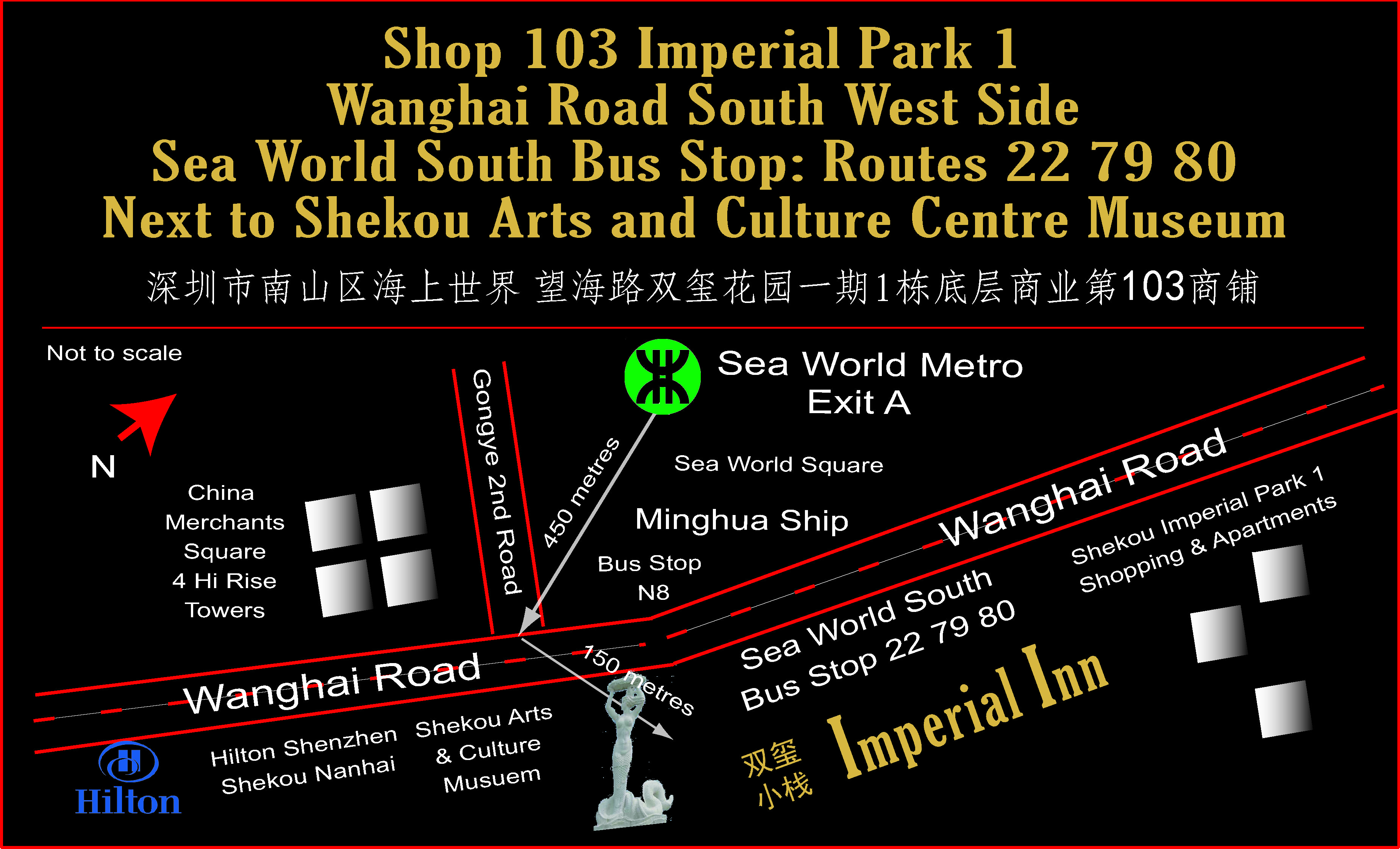 We're just 150 metres from the Nanshan Hilton, 100 metres from Shenzhen Arts & Culture Musuem and 50 metres from "Goddess" Nvwa on Wanghai Road, adjacent, on the water or South side of the Road, to the Bus Stop for routes 22 / 79 / 80 on Wanghai Road. From the North we're 1bout 75 metres south of Nanshan International Cultural Exchange {NICE}.